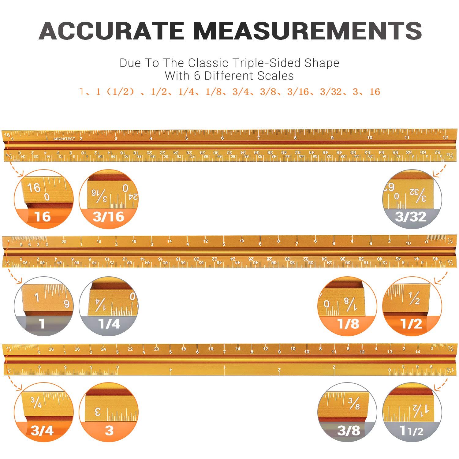 - Precision and Accuracy: 12" Triangular Architect's ruler features 3 sides with 6 different scales, You will calculate dimension and perspective for plans and other blueprints without struggling with the guesswork.