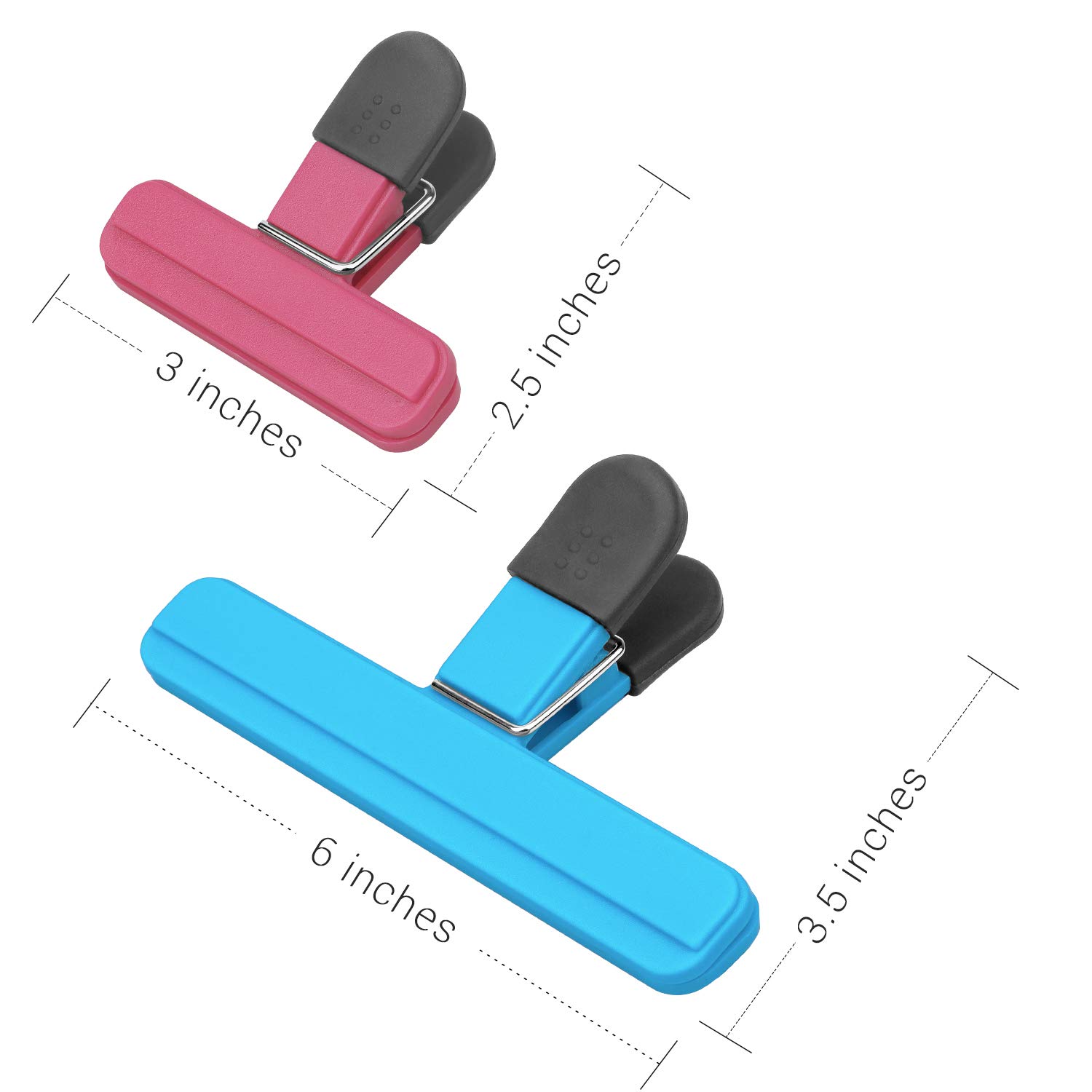 - Rich Color: Chip bag clips have 2 sizes (3 inch × 2.5 inch) and (6 inch × 3.5 inch) total 9 pack chip bag clips, rose, light green, blue.